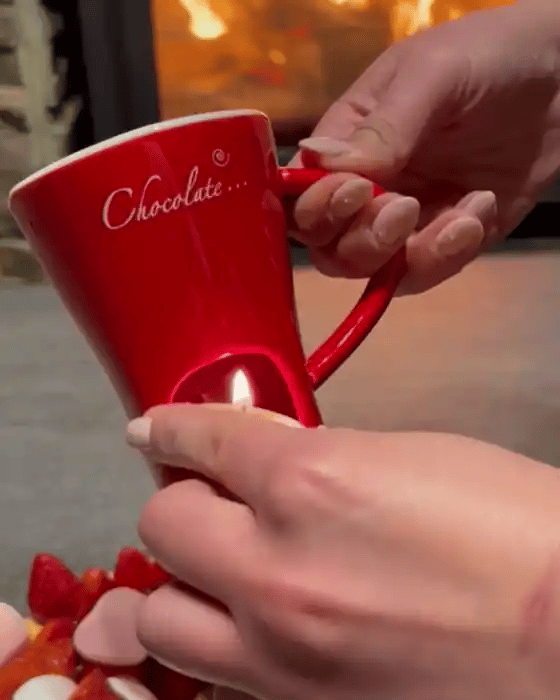 - Premium ceramic mug with handle- 2 forks + 4 tealight candles included- Candle base for gentle heating- Smooth, elegant finish- Compact and easy to store- Multi-use: chocolate, caramel, chees